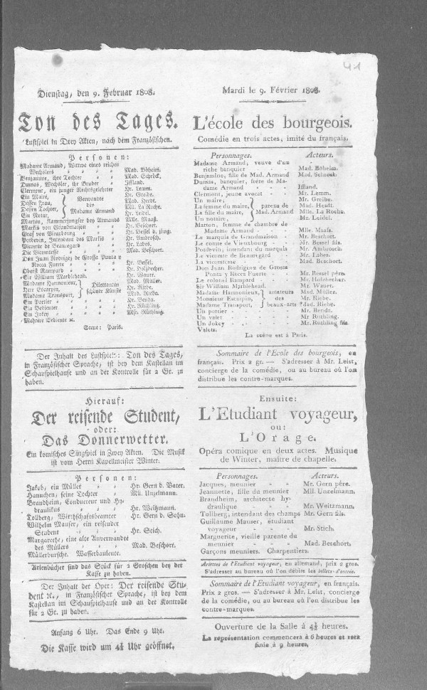 Den 20sten: Der Ton des Tages. Und: Die tiefe Trauer. (Beide zum erstenmale, zum Benefiz für Herrn Kaselitz.) / Wer sollte es dem Ton des Tages ansehen, daß es die beinahe wörtliche, gut gerathene Übersetzung eines im Jahre 1728 geschriebenen Lustspieles ist? So wenig hat sich, im wesentlichen, der Ton des Tages verändert. Dieses Lustspiel, L'Ecole des Bourgeois, vom Abbé Dallainval, wurde unverändert im Jahre 1787 wieder auf die Bühne gebracht, und nach der Revolution, mit einigen Zusätzen im dritten Akte, unter dem Titel: le Ton du jour, mit Beifall gegeben. Eine durch Lieferungen und Wucher reich gewordene Wittwe will ihre Tochter vornehm anbringen. Ein ruinirter Marquis sucht sich durch diese Heirath zu helfen, gewinnt Mutter und Tochter durch seinen leichten, hingeworfenen, bald vornehmen, bald gefälligen Ton. Um eine gnädige Frau zu werden, entsagt die Tochter ihrem bürgerlichen Liebhaber, den ihr Oheim in Schutz genommen hat. Dieser, ein schlichter Wechsler, protestirt gegen die hohe Verbindung, wird aber bei der ersten Unterredung mit dem schmeichelnden Marquis, ganz von ihm gewonnen, eingenommen, bezaubert, entzückt; bis endlich ein unrecht bestelltes Briefchen der Familie entdeckt, daß der Marquis im Begriff sey, sich mit ihr zu - enkanailliren. Der Oheim läßt die Hochzeitgäste sich versammeln (es sind die Freunde des Marquis und die Familie der Braut); und statt eines Ehekontrakts unterzeichnet der vermeinte Bräutigam den Kontrakt seiner Braut mit ihrem ersten Liebhaber. Der Gang der Handlung ist einfach, die Intrigue unbedeutend, der Knoten bald gelöst; einige Scenen, besonders die des Marquis mit dem Oheim, sind ächt-komisch und von guter Wirkung. Herrn Ifflands Spiel war in dieser Scene - doch man muß ihn sehen und hören! Wie er mit sich spielen läßt! Wie der mit dreifachem Erze geharnischte, felsenharte Mann zuletzt zum Schneemann wird, und - zerrinnt! Hr. Beschort gab den Marquis mit vieler Einsicht und Anmuth; nicht als einen abgeschmackten, eigenliebigen Geck, sondern als einen sogenannten Mann von gutem Ton und großer Welt. Dem. Maaß nähert sich mit jedem Schritte dem Ideal der feinen, gefälligen Zofe. Herr Kaselitz war, als Intendant, eher weinerlich und ängstlich, als schlau und über alle Gewissenhaftigkeit hinaus. Mutter und Tochter spielten mit Genauigkeit und blieben ihren Rollen treu. Die hochzeitliche Versammlung im dritten Akt, die Vergnügungen dabei, der rauschende Beifall darüber, Gesang, Tanz, Deklamation, war theils feine Satyre des heutigen herrschenden feinen Tons, theils Unterhaltung für das Publikum, theils Ausfüllung dieses Akts, welcher sonst das Mißverständniß mit dem Brief abgerechnet, ziemlich nüchtern ausgefallen wäre. Die beliebte Gavotte des berühmten Vestris wurde von Herrn und Madame Riebe reizend getanzt; die Romanze von Dem. Willich zwar absichtlich manierirt, gleichwohl artig gesungen; die schönste Stelle aus Raynounards Templiers (warum eben die?) übertrieben-französisch deklamirt, und das Stück mit einem Bon-mot des Marquis beschlossen.