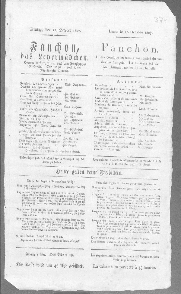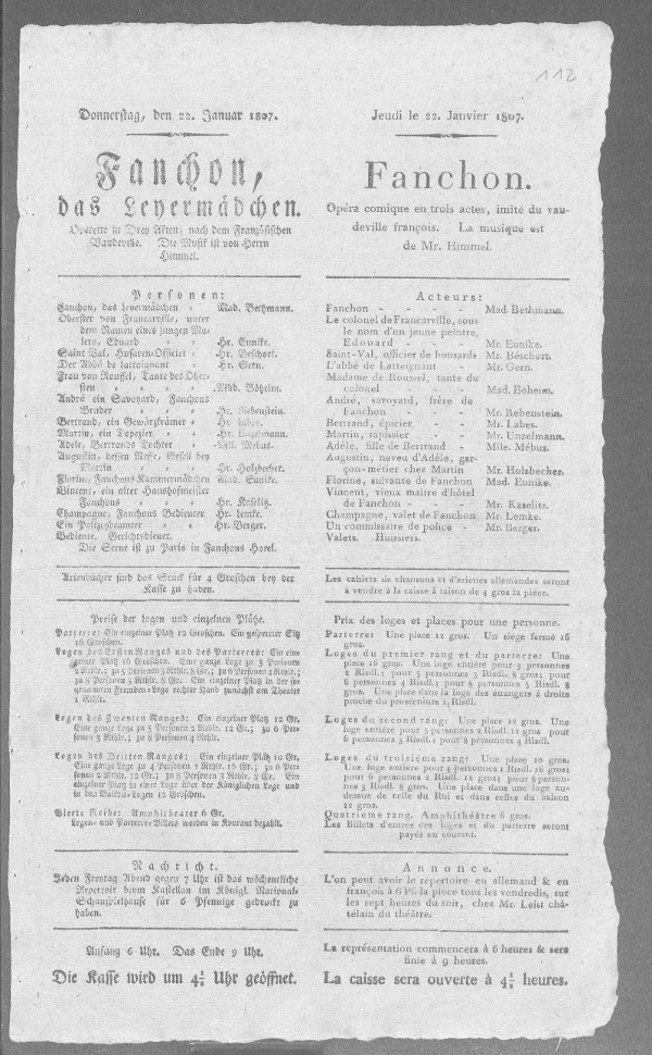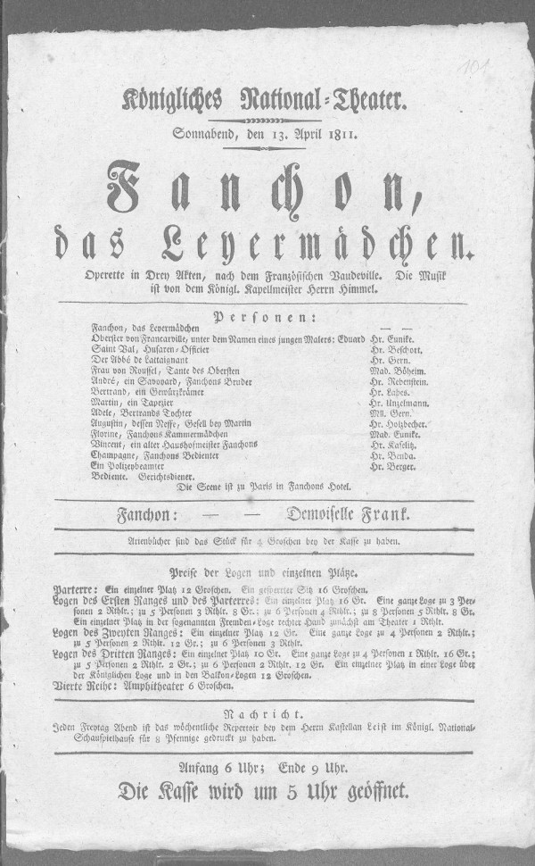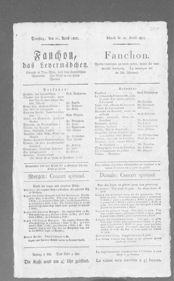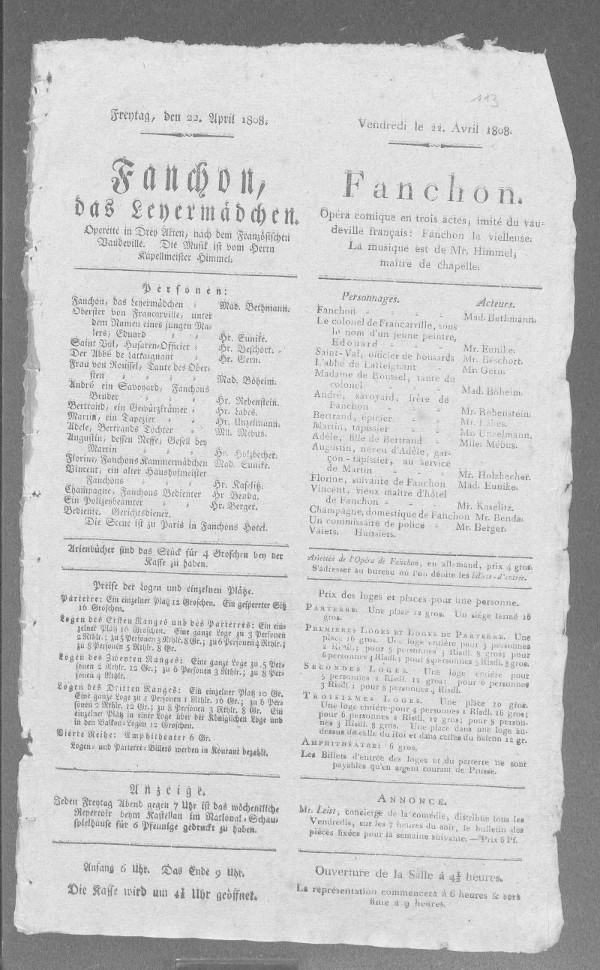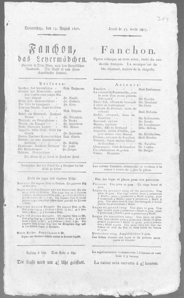 Nationaltheater: Fanchon (bearbeitet von Klaus Gerlach), Berliner Klassik, hrsg. v. der Berlin-Brandenburgischen Akademie der Wissenschaften, 2003-2013. URL: https://berlinerklassik.bbaw.de/nationaltheater/theaterstueck/128.