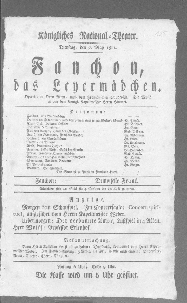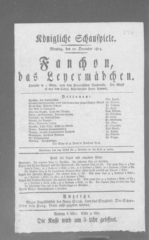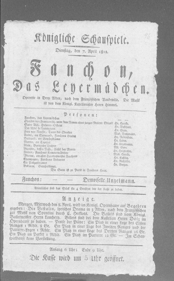 Den 16ten, zum erstenmal: / Fanchon, das Leyermädchen,