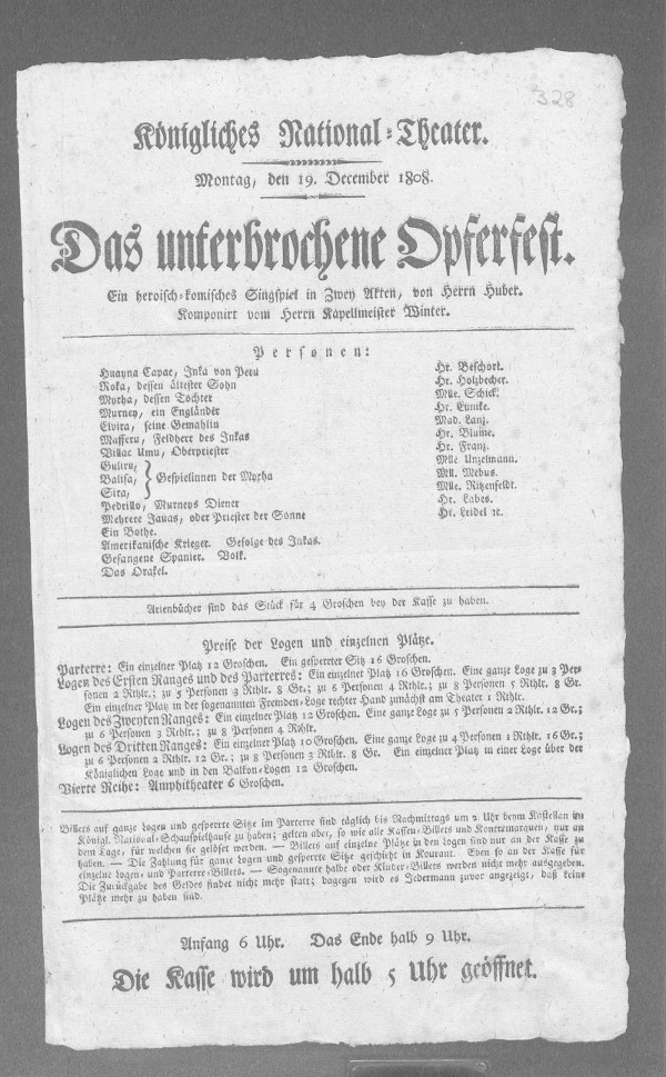 Das unterbrochene Opferfest. sg. in 2. A. v. Huber. Musik v. Winter