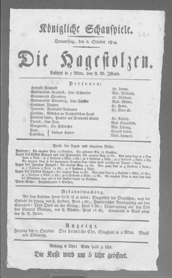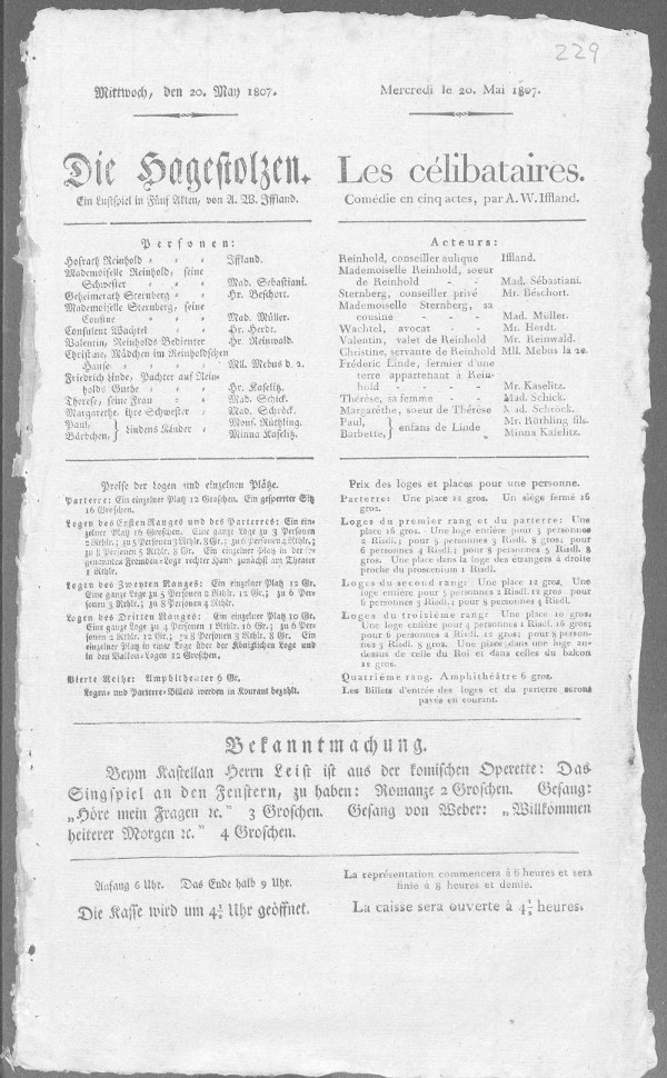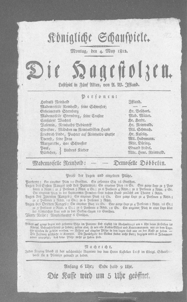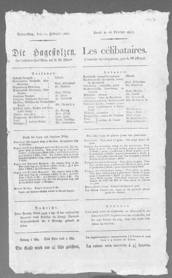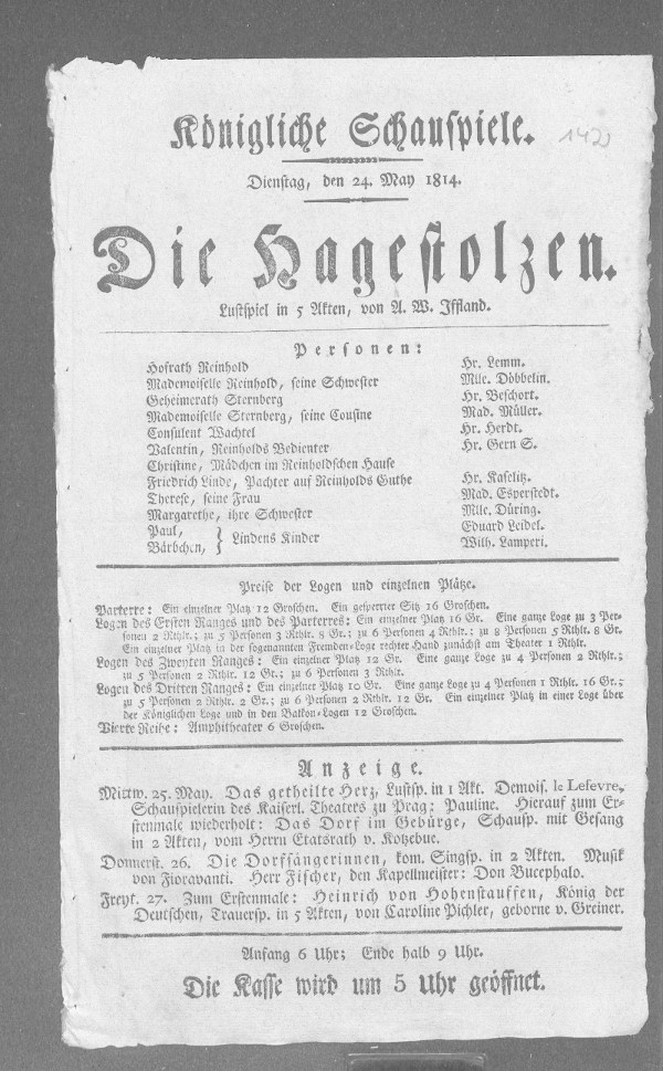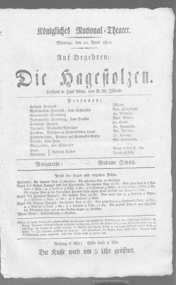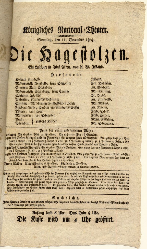 Nationaltheater: Hagestolzen, Die (bearbeitet von Klaus Gerlach), Berliner Klassik, hrsg. v. der Berlin-Brandenburgischen Akademie der Wissenschaften, 2003-2013. URL: https://berlinerklassik.bbaw.de/nationaltheater/theaterstueck/204.