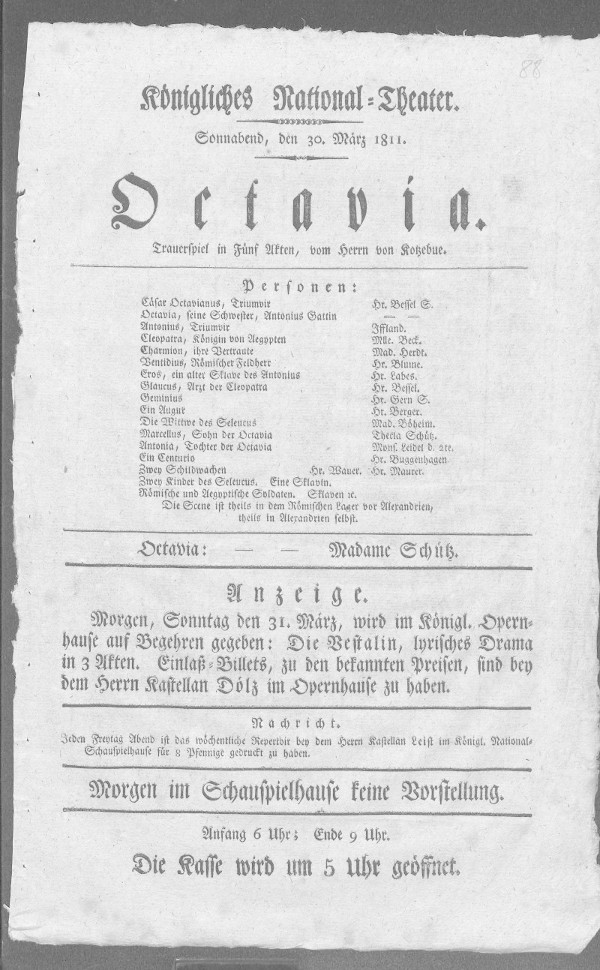 Am 20sten ward Octavia, ein Trauerspiel in 5 A. von Hrn. v. Kotzebue, wieder gegeben. Wenn das ganze Stück nicht eine der besten Arbeiten dieses Schriftstellers ist, so sind doch die beiden ersten Akte vielleicht das schönste und zarteste, was er je geschrieben hat. Wenn man eine gewisse Einförmigkeit, die in dem zweimaligen Ankommen der Octavia liegt, übersieht, so gewährt die feine Verschiedenheit in der Behandlung der beiden schwachen Männer, mit denen es das edle Weib zu thun hat, viel Vergnügen. Die Flötenmusik, unter welcher Antonius zu Anfange des zweiten Akts erwacht, ist ächt klassisch; es sind wahrhaft lydische Töne, unter denen (man fühlt es) der vornehme Weichling in den Armen der ägyptischen Königin wohl ruhen kann. Die Komposition ist von Hrn. Musikdirektor Weber. – Die ganze Darstellung verdient, als eine der harmonievollsten auf unserer Bühne ausgezeichnet zu werden. Nicht bald sind irgenwo die Rollen so gut vertheilt; jeder steht an seinem Platze, und wirkt mit zur Bildung eines schönen und kunstgerechten Gemäldes. Hr. Iffland als Antonius, Mad. Unzelmann als Octavia, Mad. Meyer als Cleopatra lassen fast keinen Wunsch übrig; so wie Hr. Labes den Sklaven Eros, Hr. Mattausch den starren Römer, Hr. Schwadke den weichen, knabenhaften Octavianus sehr brav darstellen. Selbst das Kostume ist gut beobachtet, wenn man nicht etwa sagen wollte, daß Octavia etwas zu modern angezogen wäre.