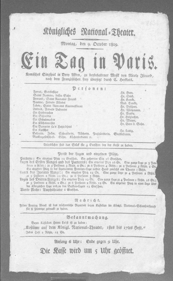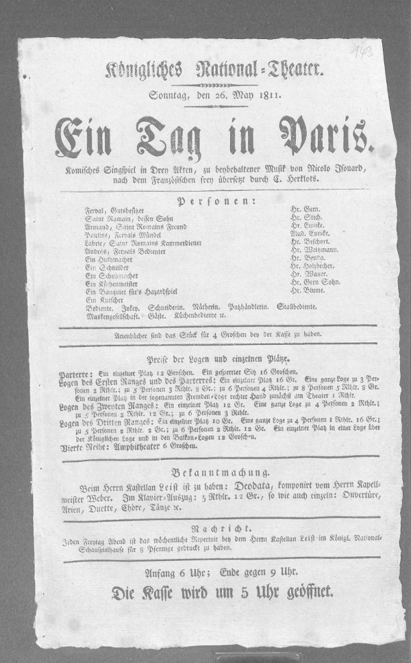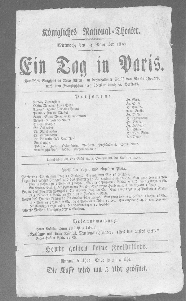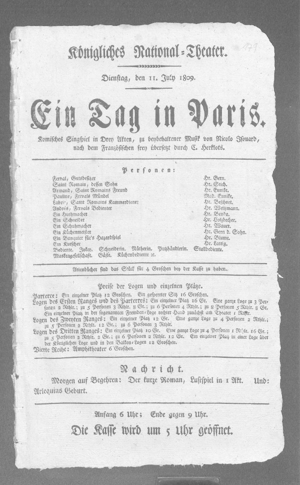 Ein Tag in Paris. Komisches Singspiel in Drey Akten, zu beybehaltener Musik von Nicolo Isouard, nach dem Französischen frey übersetzt durch C. Herklots