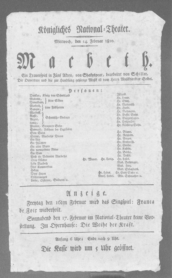 Macbeth. Ein Trauerspiel in Fünf Akten, von Shakespear, bearbeitet von Schiller. Die Ouvertüre und die zur Handlung gehörige Musik ist vom Herrn Musikdirektor Seidel