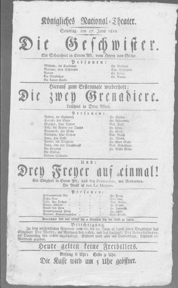 [danach: Die zwey Grenadiere Drey Freier auf einmal!] Berichtigung. Im wöchentlichen Repertoire vom 16. bis 22. Juny ist durch einen Druckfehler das Singspiel: Die Wette, auf Mittwoch den 20sten, und das Lustspiel: Die Ueberbildeten, auf Donnerstag den 21sten angekündigt. Ersteres wird aber am Donnerstag, Letzeres am Mittwoch gegeben