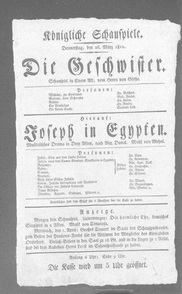 [danach: Joseph in Egypten] Anzeige. Morgen kein Schauspiel. Ueberemorgen: Die heimliche Ehe, komisches Singspiel in 2 Akten. Musik von Cimarosa Mittwoch, den 1. April: Großes Concert im Saale des Schauspielhauses, zum Besten des Pension-Fonds für die Witwen der Mitglieder des Königlichen ORchesters. Einlaß-Billets in den Saal zu 16 Gr. und in die Logen zu 1 Rthlr. sind bei dem Kastellan Herrn Leist im Schauspielhause zu haben
