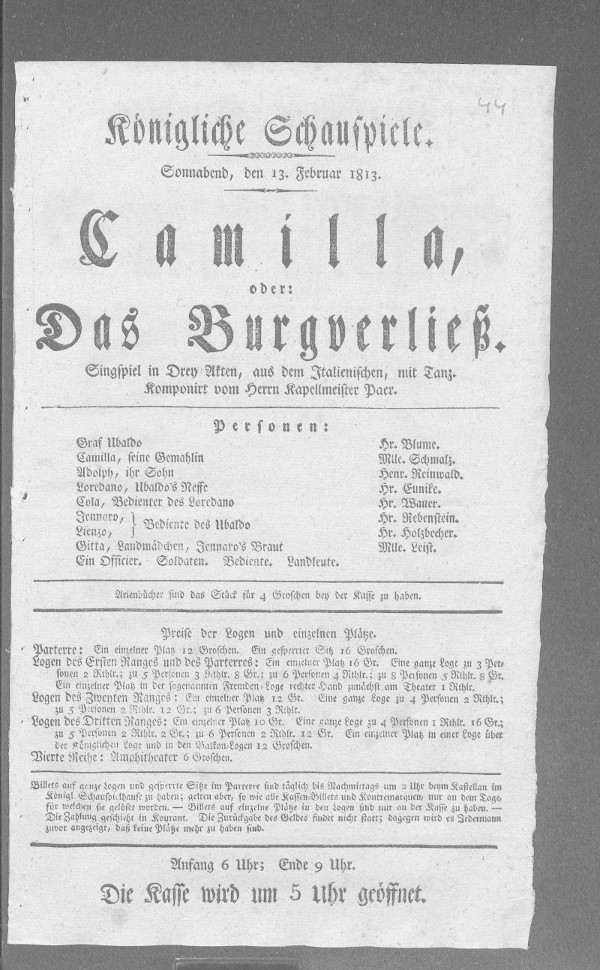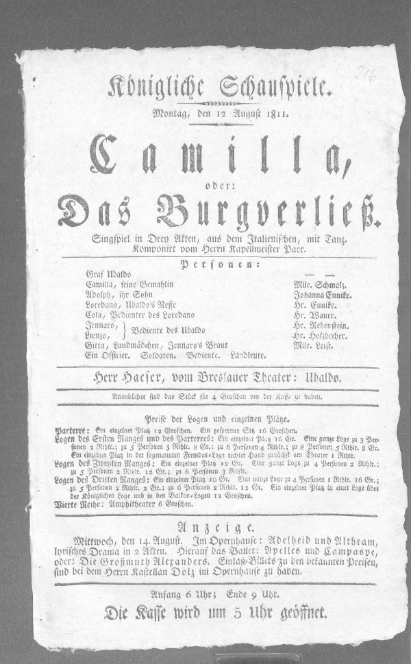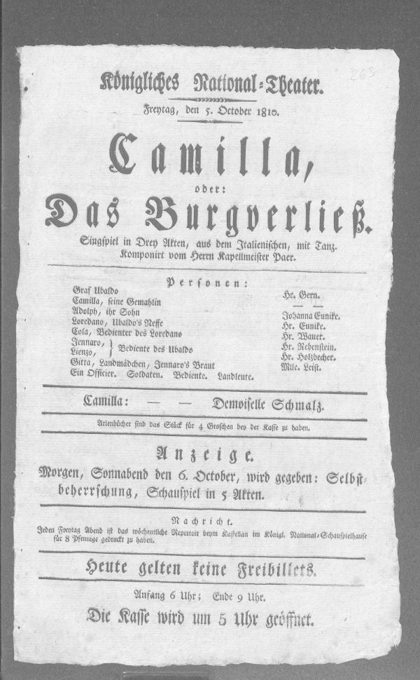 Camilla, oder: Das Burgverließ. Singspiel in 3 Akten, aus dem Italienischen, mit Tanz. Komponirt vom Herrn Kapellmeister Paer