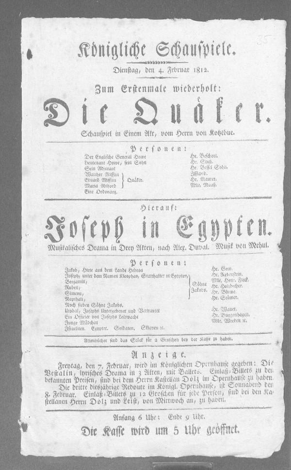 Nationaltheater: Quäker, Die (bearbeitet von Klaus Gerlach), Berliner Klassik, hrsg. v. der Berlin-Brandenburgischen Akademie der Wissenschaften, 2003-2013. URL: https://berlinerklassik.bbaw.de/nationaltheater/theaterstueck/613.