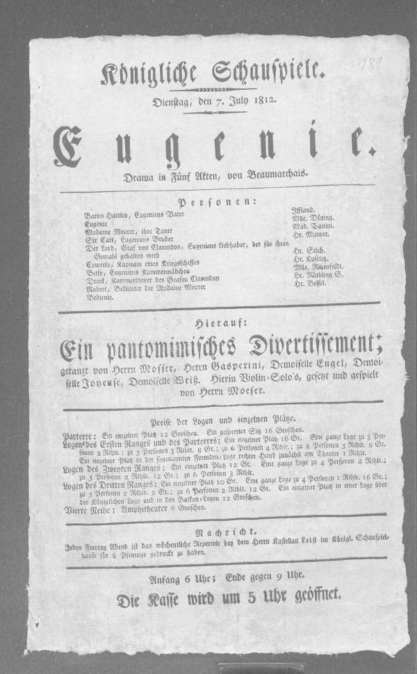 Dienstag den 7ten Juli: Eugenie, Drama in 5 Akten von Beaumarchais. Ein herrliches Werk ward dem gebildeten Publikum wiedergegeben, nach vielleicht funfzehnjähriger Ruhe, wofür die Direktion Dank verdient. Eine solche Wahl ist ehrenvoll wie die Anerkennung des Werths von Seiten der Versammlung, mehr noch für sie selbst als für den Dichter, dessen Meisterschaft sich deutlich genug hervorthut, und keiner Stütze bedarf. Wohl aber hat sie der Geschmack der Menge nöthig, denn immer schwankender, immer possenhafter erscheint er, und wenn, – frei gestanden! – großentheils auf die Leitung die Schuld sich wälzt, so muß das Bessere einen festeren Verein schließen um zu halten, was sich stürzt im Nichtgeiste der Zeit, der, im Haschen nach fadem Zeitvertreibe, überhaupt alles Erhebende verscheucht. Doch jetzt zum Plane des Schauspiels. Eugenie (Demois. Düring) ließ sich von ihrer Tante (Mad. Vanini) und ihrem Herzen verleiten, wider Wissen ihres Vaters, Lord Barkley (Iffland) ein Eheband zu schlingen mit dem Grafen Clarendon (Hr. Stich). Dieser, ein junger Wüstling, betrog sie, indem seine Diener Priester und alle bei der Feier nöthige Personen darstellten. Eugeniens Vater, der mit der Tochter und der Tante in der Provinz lebte, kommt, die Familie mitbringend, in einem Geschäfte nach London, als eben Clarendon eine sehr vortheilhafte Verbindung schließen will. Ihm droht Verderben, wenn er nicht verheirathet ist, ehe Eugeniens Loos, welches ihr auch schon Mutterhoffnungen giebt, bekannt ist, er hintergeht sie mit der höchsten Schlauheit eines ränkevollen Hofmanns, doch ein alter See-Offizier Owerly (Hr. Kaselitz) dessen Bruder Eugenie nach des Vaters Willen heirathen soll, beleuchtet im zufälligen Gespräche den Lebenswandel Clarendons, Eugenie ahnt ihr Unglück, endeckt es dem Vater und ihr Elend wird offenbar, als ein Brief von einem der Diener des Grafen die Mummerei mit der Vermählung bekennt. Die Tante, welche durch ihren Hang nach Prunk die Ursache dieses Schreckens wurde, sinnt Rache, sie läßt den Grafen zu sich bitten, er erscheint, in einem Augenblicke, wo er Gelegenheit hatte, Eugeniens Bruder, Sir Carl (Hr. Maurer) aus den Händen von Meuchelmördern zu retten, gedungen von dessen Obristen den Sir Carl, von jenem beleidigt, in einem Duell entwaffnete und dann zu eigenem Schutz nach London floh, ohne Nachricht zu bahen, daß seine Familie sich auch hier befindet. Clarendon entdeckt, jedoch mit schmückenden Nebenumständen, dem jungen Manne, was ihn nach diesem Hause führt und bittet ihn zu verweilen. Sir Carl bemerkt Anstalten, welche die Tante machte, um den Grafen zu zwingen, Eugeniens Ehre herzustellen, er will seinem Retter vergelten und setzt in seinem Grimme den Vater der eben erscheint, den Degen auf die Brust. Jetzt folgt die Entdeckung und das Entsetzen der schrecklichen Verhältnisse, der Tante Hinterlist wird unschädlich, doch Sir Carl will die Schmach der Schwester rächen, ihm zerbricht der Degen im Duelle mit Clarendon, dieser kehrt zurück, von dem Schauderhaften in den Vorfällen wahrhaft ergriffen u. von inniger immer durchscheinender Liebe zu Eugenien, er bestürmt mit vollem Redeglühen Aller Herzen und besiegt endlich den Stolz der britischen Gemüther durch eine Reue, mit der ein friedlicheres Leben beginnt. Die Reichhaltigkeit des Stoffes wird durch die meisterhafte Zeichnung der Charaktere gehoben und wenn man diese Sicherheit in sich aufnimmt, wird Beaumarchais anerkanntes Durchschauen der Menschen und aller Lebensverhältnisse jedem deutlich vor die Seele treten. Welch ein Vergnügen ist es, dem Geiste eines Mannes zu folgen, dessen Erfahrungen in Jahren er in wenigen Stunden uns hinstellt, verwebt mit dem ewigen Grundsatz: daß nur Rechtlichkeit und offner Sinn uns einen Frieden sichern, ohne den das Daseyn vernichtet ist: Welch’ eine Freude ist es, für den, der beurtheilen darf, nur loben zu können! – Die Uebersetzung hat Stellen, die höher stehen könnten, und die ein wenig veraltet sind, aber sie ist sonst sehr lobenswerth, und der Gedanke des Dichters, die Akte nur durch das Stillstehen der Handlung anzudeuten, ist nicht unangenehm. Iffland gab den Barkley mit entzückender Wahrheit, die wenigen Momente, wo sein Sprachorgan ihn verließ, deckte er mit seiner Größe als darstellender Künstler. Herr Stich als Clarendon bewieß: daß der Vorwurf von Einseitigkeit, den ihm selbst der Referent zu machen sich bewogen fand, nicht immer gerecht ist, er stellte den Kampf des Guten und Bösen im schwankenden Gemüth recht vorzüglich auf und wird gewiß mehr noch dem erwähnten Vorwurfe entkommen, wenn er jeden Charakter mit tieferem Eindringen in seine Eigenthümlichkeiten in sich verschmelzt. Sir Carl hätte sich ein wenig bedeutender machen können, Owerly war zu sehr Herrn Kaselitz nachgebildet. Herr Rüthling der Sohn trug mit dem charakterlosen Kammerdiener Clarendons, der gar nicht leicht darzustellen ist, eine zu schwere Last, und Mad. Vanini hatte nur lobenswerthe Momente, zu welchen die, wo sie ihre Rolle nicht recht wußte, nicht gezählt sind. Mit Vorbedacht ist Eugenie bis zuletzt gelassen, denn Dem. Düring erschien in diesem Charakter, der dauernd von wechselnden Gefühlen bestürmt ist und das höchste Studium erfordert, wie ausgesetzt und hingegeben, um sich selbst zu stürzen. In ein Zergliedern eingehen wäre härter als es zu seyn erlaubt ist, es thut dem Referenten schon sehr weh, sagen zu müssen was er sagte. Solche Anordnung aber, welche der jungen Schauspielerinn diese Rolle zuwandte, kann niemand gut heißen, sie ist eine Grausamkeit an der Beginnenden und an jedem Fühlenden in der Versammlung. Es ist Pflicht, dem Publikum alles so gut zu geben als möglich, es ist höchst tadelnswerth, wenn es nicht geschieht bei Werken verstorbener Dichter, deren Andenken zu ehren man verstehen muß, es ist verderblich, durch solche Versuche Werke auszurotten im Repertoir, die durch alle Zeiten leben und auch nutzen kö